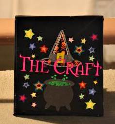 The Craft: This movie came out when I was in 8th grade and I loved it. It is such a great movie for my generation. This table and movie represents witches! A classic part of Halloween. The color for this table was pink. For this sign, I digitized the font using the same font that they used for the movie posters. It took a log time to find this font and had to use a font search engine that allows you to upload pictures of the font and then searches for the same font. I had the most difficult time finding this font. I also used a giant cauldron and some pretty stars to jazz it up. Let me tell you...all those thread changes with the stars was not fun! What was I thinking??? But it looked so good...I think it was my favorite sign of all of them.